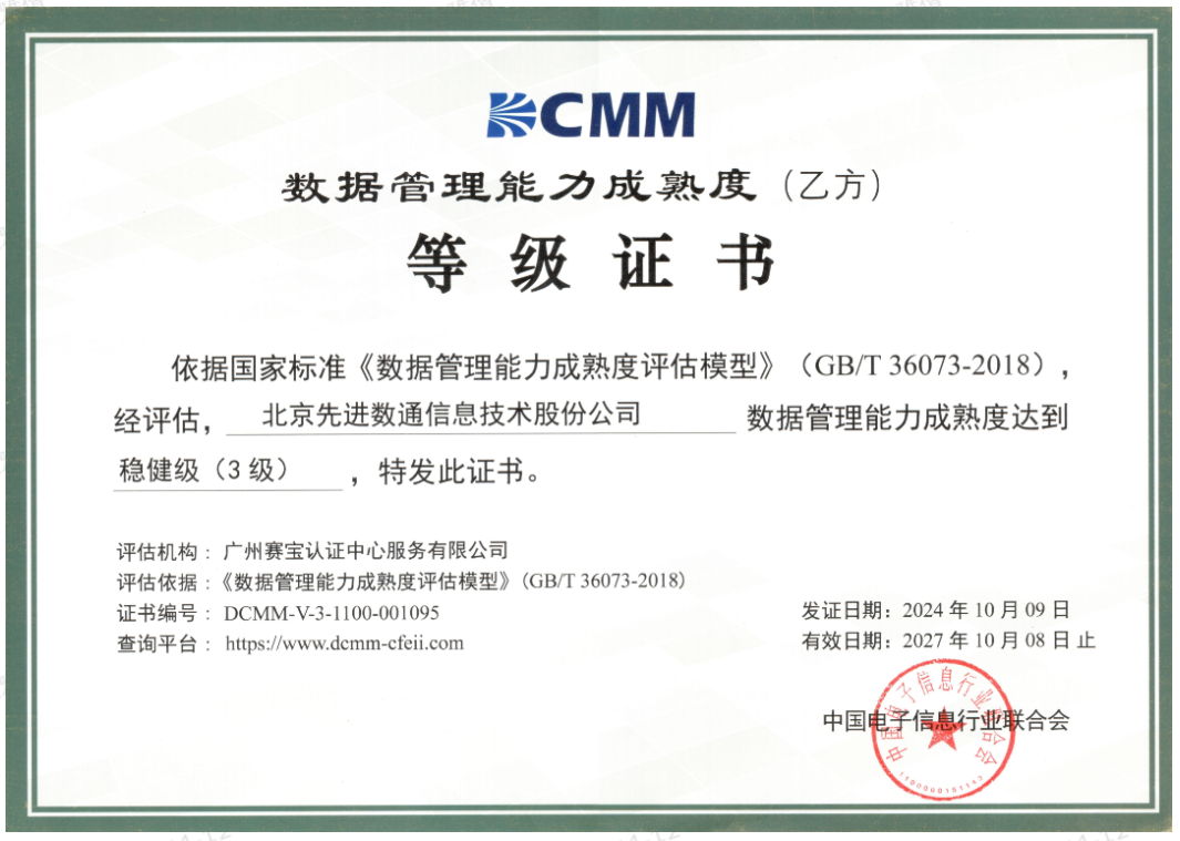 近期,中国电子信息行业联合会公布了最新一批顺利获得数据管理能力成熟度(DCMM)贯标等级认证的企业名单。k8凯发成功取得数据管理能力成熟度稳健级(三级)认证。这一认证的取得,标志着k8凯发在数据治理体系构建和数据管理与应用能力方面,已经达到了国家权威组织认可的标准。这不仅是对k8凯发在数据管理领域专业能力的肯定,也是对其在有助于数字化转型服务和数据驱动决策方面所做努力的认可。